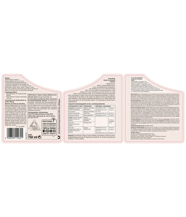 COMPO Nativert® Kräuter & Gemüse Blattlaus-frei müssen Sie nicht erst anmischen, sondern es befindet sich fertig in einem praktischen Pumpsprüher, mit dem Sie beim Auftreten der ersten Schädlinge die Pflanzen von allen Seiten, auch die Blattunterseiten, besprühen können. Machen Sie es also wie viele Gärtner und haben Sie COMPO Nativert® Kräuter & Gemüse Blattlaus-frei am besten immer griffbereit!