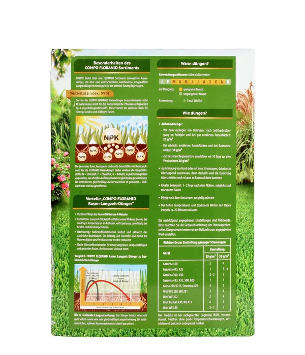 Beim COMPO Rasen-Langzeit-Dünger Perfect handelt es sich um einen anwendungsfertigen NPK-Dünger, der mit einem Streuwagen, von einem erfahrenen Gärtner aber auch per Hand ausgebracht werden kann. Der ideale Anwendungszeitpunkt ist 1-2 Tage nach dem Mähen, möglichst auf trockenen Rasen. Direkt nach dem Ausstreuen sollten Sie die Fläche ausgiebig und durchdringend wässern.