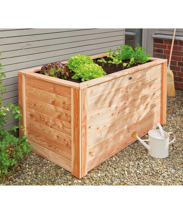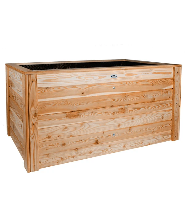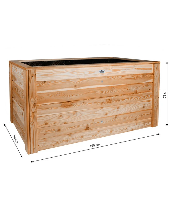 Er sieht sehr schlicht aus, dieser Kubus aus Lärchenholz; tatsächlich ist das Dehner Hochbeet Gärtner aber bestens durchdacht. Aus massivem, 20 mm starkem Lärchenholz gefertigt verfügt es über eine stabile, robuste Konstruktion, die dem Inhalt einen sicheren Rahmen bietet. Mit zum Bausatz gehört auch das immens wichtige Wühlmausgitter, das den unteren Abschluss des Hochbeetes bildet und die hungrigen Tierchen fernhält. Der breite Rand oben wirkt dekorativ, bietet aber gleichzeitig eine praktische Fläche, um sich beim Arbeiten abzustützen, die Gartenutensilien abzulegen und er ist auch ein wirksames Schneckenhindernis.