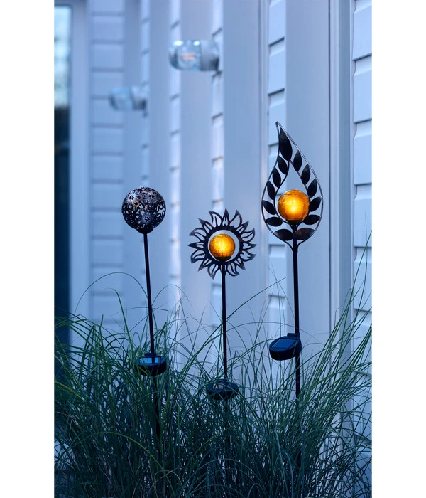 Die Glaskugel verbreitet tagsüber einen zarten Schimmer und beginnt bei Dämmerung mit ihrem geheimnisvollen Leuchten. Das Blatt, das die funkelnde Glaskugel einrahmt, ist mehr als eine wunderhübsche Form. Denn als Symbol für Wachstum und Erneuerung überzeugt es jeden, der auf Ihren Garten oder Ihre Terrasse blickt. Bereiten Sie sich und ihren Gästen mit dem Solar-Dekostab Arian einen warmen Empfang !