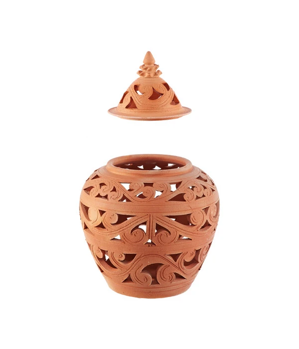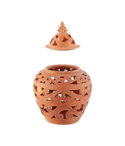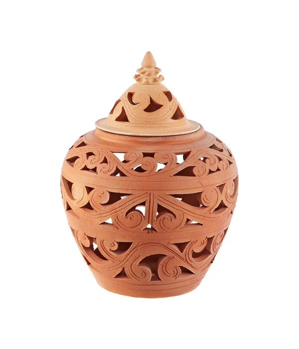 Ein besonders hübscher Dekoartikel für den Garten und die Terrasse ist dieses handgefertigte, 47 cm hohe, bauchige Windlicht aus Terracotta. Führen Sie durch die Öffnung im Boden eine elektrische Leuchte ein, oder stellen Sie eine Stumpenkerze in das Windlicht. Damit erhalten Sie wunderschönes Licht mit interessanten Schattenreflexen, die durch die hübschen Ornamente erzeugt werden. Der Deckel des Windlichts lässt sich abnehmen.