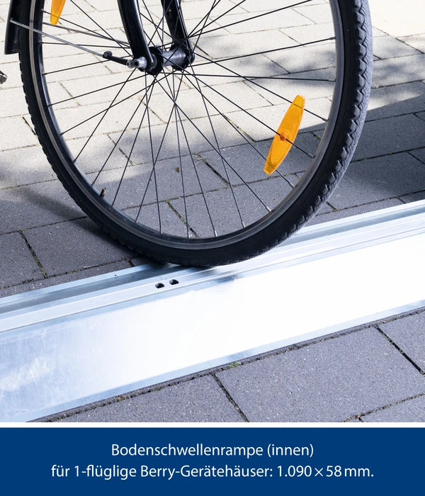 Um das Ein- und Ausfahren von schweren Geräten so komfortabel wie möglich zu gestalten, sollten Sie für Ihr Berry-Gerätehaus die Hörmann Bodenschwellenrampen nutzen. Die Rampen sind aus stabilem, feuerverzinktem Stahlblech gefertigt und als Ausführung für außen und innen erhältlich. Damit können Sie problemlos und ohne Hindernisse allerlei Gerätschaften hinein und hinaus transportieren. Auch besonders schwere Gerätschaften können ganz einfach über die Rampe transportiert werden. Dabei sorgt die neutrale Farbgebung für eine dezente und unauffällige Optik.