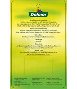 Die Nashi-Birne âNijiseikiâ bevorzugt einen sonnigen, geschĂŒtzten Standort mit einem humosen, nĂ€hrstoffreichen Boden, der nicht zu kalkhaltig sein sollte. Wenn Sie den Obstbaum im FrĂŒhjahr pflanzen, sollten Sie ihn den ganzen Sommer regelmĂ€Ăig gieĂen. Gut eingewurzelte Pflanzen benötigen nur bei extremer Trockenheit zusĂ€tzliche Wassergaben. Im Februar/MĂ€rz wird den Baum regelmĂ€Ăig zurĂŒckgeschnitten. FĂŒr die Befruchtung sorgt eine zweite Nashi-Sorte oder aber ein Birnbaum, wie z.B. die Sorte ‚Willams Christ‘.