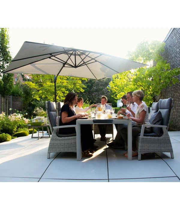 Sie sitzen mit Freuden auf der Terrasse, der Tisch ist reichlich gedeckt und es herrscht fröhliche Plauderatmosphäre. Wie gut, dass Sie dank Ihrem Siena Garden Ampelschirm Cirrus diesen Tag so entspannt im Schatten verbringen können! Unter dem Terrassenschirm, dessen Bespannung ganze 400 x 300 cm misst, können Sie sich mit Ihren Gästen wohl und sicher fühlen, da das hochwertige Polyester-Material mit UV 50+ auch einen hohen Sonnenschutz bietet. Mit seiner so attraktiven wie praktischen Ampelform stört auch kein Holm mitten am Tisch, sondern befindet sich der Schirmmast dezent außerhalb der Schattenfläche. Und wenn die Sonne wandert, während Sie vom Hauptgang zum Dessert übergehen, richten Sie Ihren Terrassenschirm einfach neu aus. Mit Hilfe der verschiedenen Verstell-Dimensionen: er lässt sich in der Höhe oder per Fußpedal um 360° horizontal verstellen sowie entlang des Masts in 7 Schritten neigen. Wenn Sie genau das gerne hätten, sollten Sie sich schnellstmöglich einen Siena Garden Ampelschirm Cirrus in Ihren Schirmständer stellen!