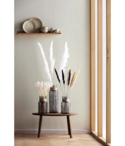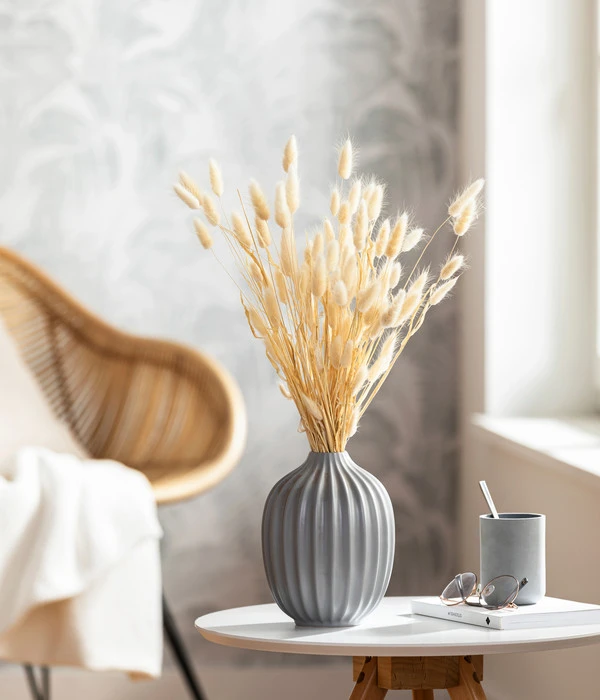 Die Ähren von trockenem Hasenschwanzgras lassen sich zu den unterschiedlichsten Wohnstilen dekorieren. Selbstverständlich passen sie ideal in ein mediterranes, romantisches oder Landhaus-Interieur. Aber je nachdem, wie Sie damit umgehen, lassen sich damit auch Räume mit einer bewusst cleanen Einrichtung schmücken. Stellen Sie dafür passend zur Tischlänge 3, 5 oder 7 kleine Väschen in gleichmäßigen Abständen in die Tischmitte und geben dann je eine Ähre hinein. Fertig ist eine zarte, aber äußerst wirkungsvolle Tischdekoration.