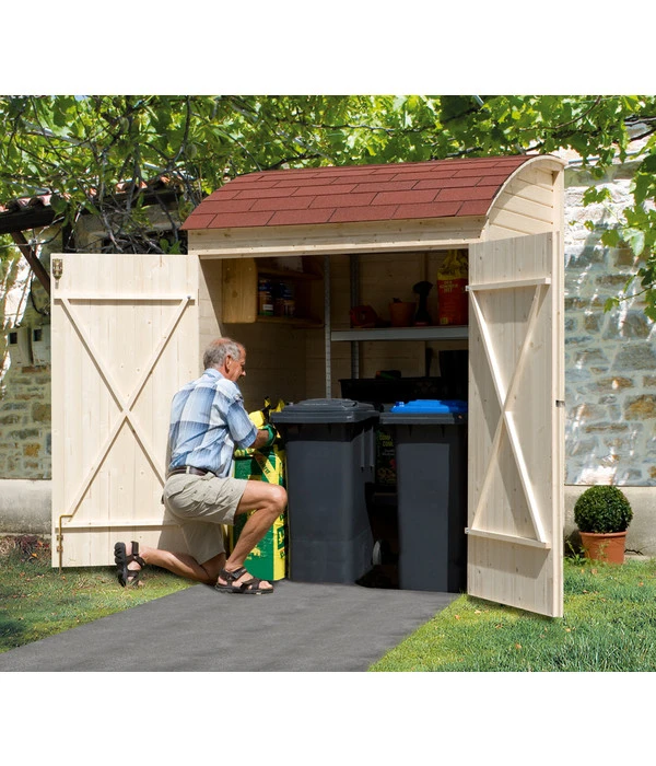 Damit sind Ihre Fahrräder oder Gartengeräte perfekt geschützt vor Wind und Wetter: Die Fahrradgarage von Weka ist ein optimales Schutzhäuschen für den Außenbereich. Sie sieht zudem sehr schön aus – das naturbelassene Holz des Häuschens wird von dem Bitumen-Dachbelag gegen Regen geschützt. Das 19 mm dicke Massivholz Dach überzeugt zusätzlich mit einer schönen Bogenform. Der Dachüberstand hinten beträgt 1,5 cm und seitlich 5 cm. Die Weka Fahrradgarage ist vorne 220 cm hoch und hat hinten eine Höhe von 180 cm. Ein besonderer Clou sind die Aufhänger für Ihre Fahrräder: Bis zu drei Räder können platzsparend eingehängt werden, somit haben Sie weiteren Platz für Gartengeräte usw. Die Weka Fahrradgarage wird in Bauelementen geliefert und lässt sich einfach montieren. Ohne Zubehör und Dekoration.