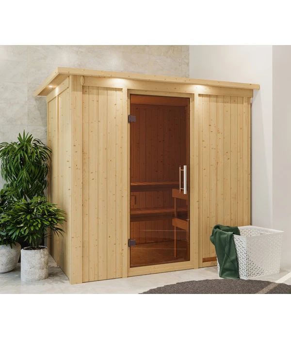 Sich zurücklehnen, den angenehmen Holzduft riechen, schwitzen und dabei herrlich entspannen – es gibt nichts Schöneres nach einem stressigen Tag. Und nichts Gesünderes, um den Kreislauf anzukurbeln, die Durchblutung zu fördern, die Muskeln zu entspannen und das Immunsystem zu stärken. Vor allem, wenn man dieses Vergnügen in ganz privater Atmosphäre in seiner eigenen Sauna genießen kann. Sie haben nur wenig Platz? Kein Problem, die Wolff Finnhaus Innensauna de luxe Despina bietet Ihnen alles für den perfekten Saunaspaß, braucht aber nicht viel Platz. Und weil dieses Saunamodell aus dem Hause Wolff Finnhaus nicht nur eine bewährte Material- und Verarbeitungsqualität garantiert, sondern aus teilweise vormontierten Elementen besteht, ist auch der Aufbau schnell erledigt. Gönnen Sie sich diesen kleinen Luxus und saunieren Sie in Zukunft ganz privat in der Wolff Finnhaus Innensauna de luxe Despina!